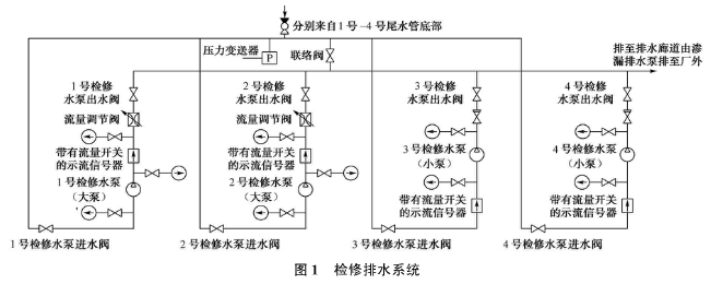 桐柏電站的檢修排水系統(tǒng),共設(shè)4臺排水泵,如圖1所示,1號、2號檢修水泵(大泵)用于排空引水隧洞、蝸殼、尾水管、尾水隧洞內(nèi)的水;3號、4號檢修水泵(小泵)用于球閥、上下庫閘門等的滲漏排水。每臺檢修水泵均配置逆止閥、壓力表和帶流量開關(guān)的示流信號器,在1號、2號水泵出水管處各安裝了一個流量調(diào)節(jié)閥。系統(tǒng)中共有2根總管,一根為水泵的總吸水管,包括從每臺機(jī)組尾水管底部至總管的支管,總吸水管和部分支管及管路上的操作閥門布置在廠房管路廊道中;另一根為總排水管,可將水排至滲漏集水井中,再經(jīng)滲漏排水泵排至下庫。