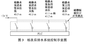 它結(jié)構(gòu)是利用旁通管的原理,主導(dǎo)管內(nèi)的液位和尾水管內(nèi)的液位高度一致,根據(jù)阿基米德定理,磁性浮子在液體中產(chǎn)生的浮力和重力平衡,當(dāng)尾水管中的水位升降時,液位計(jì)主導(dǎo)管內(nèi)的浮子也隨之升降,浮子內(nèi)的永久磁鐵通過磁耦合驅(qū)動指示器內(nèi)的翻板指示器,當(dāng)液位上升或下降時,翻板指示器由白色翻轉(zhuǎn)為紅色,或由原來的紅色翻轉(zhuǎn)為白色,指示器的顏色改變的高度就是被測水位的實(shí)際高度,從而實(shí)現(xiàn)液位的現(xiàn)場指示,以供運(yùn)行人員目測尾水管的實(shí)時水位。安裝于液位計(jì)管壁外側(cè)的磁記憶開關(guān),可多點(diǎn)設(shè)置、滑動調(diào)整位置,提供了液位開關(guān)量報(bào)警功能。在裝置的頂部安裝了一個自動排氣裝置,當(dāng)主導(dǎo)管內(nèi)液位上升時能夠自動的排氣,下降時能夠按時補(bǔ)氣。現(xiàn)場安裝頂裝式磁翻板液位計(jì)時,裝置標(biāo)尺的0位,對應(yīng)的實(shí)地高程為EL.40.0m。浮子開關(guān)設(shè)定5個水位動作值,檢修水位低開關(guān)量報(bào)警值對應(yīng)的高程為40.3m;停止所有檢修水泵的開關(guān)量,所對應(yīng)的高程為40.5m;啟動主用檢修水泵的開關(guān)量,所對應(yīng)的高程為40.9m;啟動檢修水泵主用泵的開關(guān)量,以及要求手動啟動大泵,并作為水位高報(bào)警上送上位機(jī),所對應(yīng)的高程為41.1m與41.2m,兩個開關(guān)量并列接入。全部開關(guān)量分別送入PLC,如圖3所示。