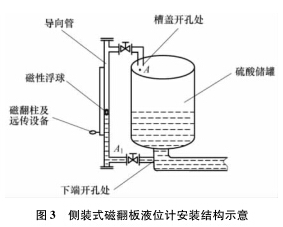 ⑤導向管上下端部均采用法蘭式密封,以便維護。側裝式耐高溫磁翻板液位計的安裝結構如圖3所示。