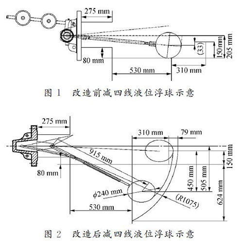 針對減四線液位測量進行大轉角、切割集油箱改造,有效量程大于設計量程的80%,其改造測繪圖如圖2所示。改造后,安裝支架120 mm,插入深度為1?。保担担恚?,實際測量液位達450mm,儀表接液部位全部選用317材質。轉軸—杠桿套筒、杠桿套筒—連桿、浮球—連桿的固定連接節點及加工焊接坡口增加焊接強度;對于活動節點,采用專用銷子固定。