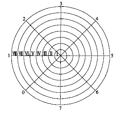 1.2.2 幾何測量法根據立式金屬罐容量試行檢定規程,把圓錐體底圓分成M 個同心圓,根據所分圓環面積相等條件決定半徑。圓錐體分為一個小圓錐和多個圓臺。在每個圓心圓周測N 個點,即測N 個點到罐底中心的高度。底量測量原理見圖2。