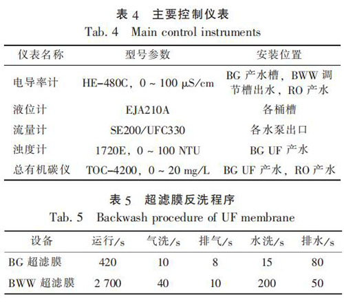 膜處理工藝應用中, 通量下降過快是影響系統正常運行的主要因素。 而人工清洗需要耗費大量人力, 為此通過程序設定實現自動反洗。BG 和 BWW 超濾膜采用先氣洗后水洗的清洗模式, 程序設定見表 5。