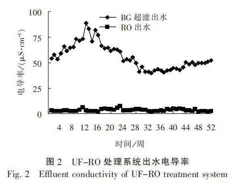 經過 1 年的連續運行, 晶背研磨廢水進水 TOC質量濃度為 0.5 ~ 5.0 mg / L, 濁度為 80 ~ 100 NTU,SiO2 質 量 濃 度 為 2 ~ 4 mg / L, 反 洗 廢 水 進 水 TOC質 量 濃 度 為 1.5 ~ 3.0 mg / L, 濁 度 為 4 ~ 8 NTU,UF-RO 處理出水 TOC 質量濃度低于 1 mg / L, 濁度低于 0.1 mg / L, SiO2 質 量 濃 度 低 于 1 mg / L, 完 全可以回用至超純水預處理系統。 UF-RO 處理系統出水電導率和 TOC 濃度見圖 2 ~ 圖 3。
