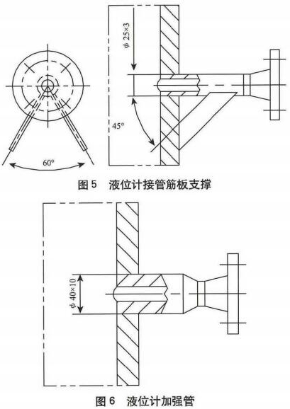 圖5是泄漏重油液位計接管結構,雖然必25mmx35mm接管的開孔補強滿足GB150-1989標準[11“開孔不另行補強”的要求,但卻不符合現行標準GB/T150-2011的“開孔不另行補強”要求。因為,兩標準雖然限制的設計壓力(<2.5MPa)與接管外徑(<89mm)等條件相同,但是后者改版標準卻對接管壁厚及腐蝕裕量增加了要求,這是合理的改進完善。對于本例的425mm接管,滿足GB/T150-2011的“開孔不另行補強”條件的管壁厚度至少應為5.5mm(按標準規定當腐蝕裕量為1mm時,接管厚度應不小于3.5mm)。所以,按HG/T20583-2011對小接管避免彎曲而推薦的加強結構優先選用加強管形式建議將液位計接管更改為圖6的加強管結構。這樣不但解決了小接管的開孔補強和防彎曲加強問題,也可以使小接管的設計使用年限與罐體一致,而且便于保證小接管與罐體采用插人式全焊透角焊縫的焊接質量。
