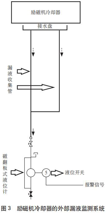 實際運行經驗表明,防凍液位計內部銅管發生泄漏的概率較低,但一旦發生泄漏,漏液會隨著冷卻空氣沿閉合風路進入勵磁機內部,造成勵磁機短路損壞的嚴重后果。為了保證機組安全,應有冷卻器內部銅管泄漏監測裝置,然而現場沒有配置此類裝置。