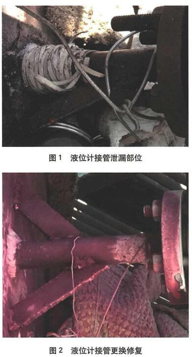 圖1是分離罐液位計接管泄漏部位,圖2則是停工搶修更換并經檢查合格的丙酸液位計接管。泄漏發生在丙酸液位計接管靠近罐體部位(臨時用白色膠帶纏繞處),修復后的丙酸液位計接管仍釆用原設計結構,但接管壁厚增加,變更為必25x4mm。