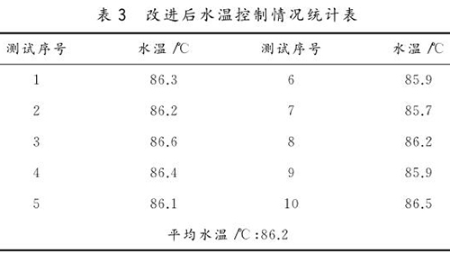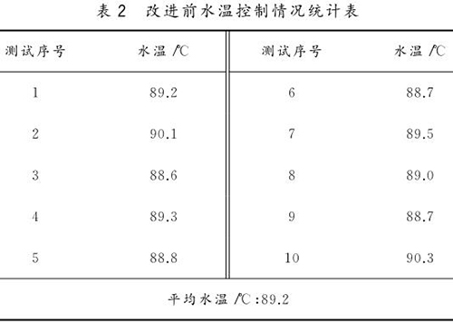 根據(jù)生產(chǎn)標(biāo)準(zhǔn)設(shè)定水溫為85℃,進(jìn)行了10次測(cè)試,平均水溫為89.2℃(見(jiàn)表2),超出了設(shè)定溫度4.2℃。