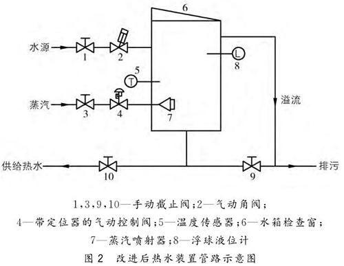改進(jìn)后的熱水裝置主要由水源、蒸汽源、帶定位器的氣動(dòng)控制閥、手動(dòng)截止閥、蒸汽噴射器、溫度傳感器、浮球液位計(jì)、水箱以及溢流管路等組成。其工作過(guò)程為: