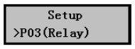 1) 在儀表正常工作時按擊Mode鍵進(jìn)入?yún)?shù)設(shè)置菜單后按擊▼鍵選擇到P03(Relay)繼電器設(shè)置菜單,如右圖所示。