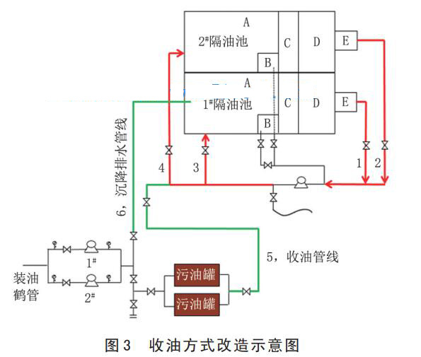 針對(duì)拉運(yùn)頻次高,成本費(fèi)用高,危廢產(chǎn)量大的問題,將原環(huán)保試驗(yàn)污水罐改造為污油暫存罐,增設(shè)隔油池收油池至污油罐流程 (圖 3,流程 5),將收集的污油集中在污油罐內(nèi),達(dá)到一定液位后,用罐車?yán)\(yùn)至輪南環(huán)保站。該措施提高了污油儲(chǔ)存容積,大大降低了罐車?yán)\(yùn)頻次。同時(shí),增加污油暫存罐至隔油池流程 (圖 3,流程 6),罐內(nèi)污油重力沉降后,底部污水壓排至隔油池,降低了污油中混水比例,大大減少了轉(zhuǎn)運(yùn)危廢的數(shù)量。