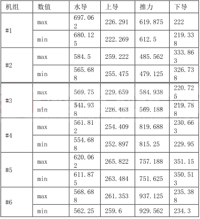 從監(jiān)控系統(tǒng)取出的數(shù)據(jù)有#1-#6 機(jī)組的水導(dǎo)、上導(dǎo)、推力、下導(dǎo)各部軸承油位數(shù)據(jù),分別有機(jī)組檢修后未開(kāi)機(jī)的油位、機(jī)組運(yùn)行時(shí)的油位、機(jī)組運(yùn)行后停機(jī)的油位三種機(jī)組狀態(tài)下的數(shù)據(jù),計(jì)算分析如下:
