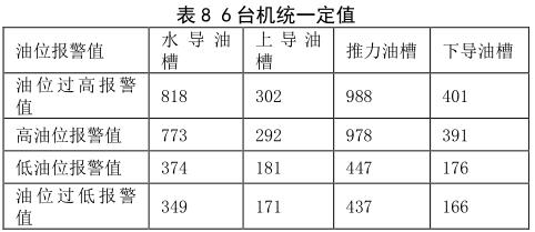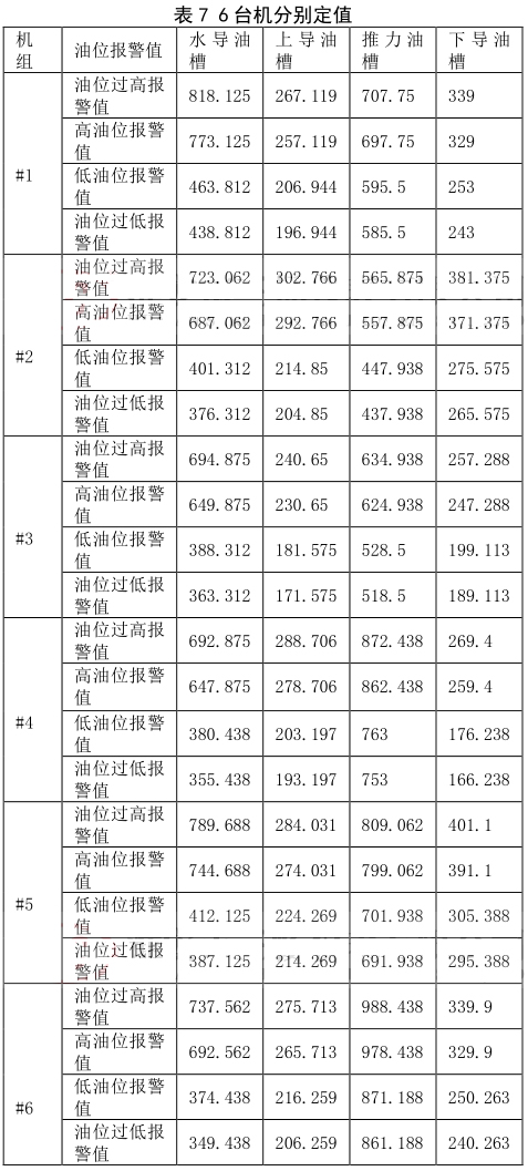 (2)依據(jù)成都勘測(cè)設(shè)計(jì)院給的定值要求,建議每臺(tái)機(jī)設(shè)置不同的報(bào)警值。設(shè)置原則:在上導(dǎo)、下導(dǎo)、推力各部油槽油位,結(jié)合機(jī)組運(yùn)行時(shí)的油位*大值上設(shè)置高油位報(bào)警值+20mm、過(guò)高油位報(bào)警值 +30mm;*低油位值上低油位報(bào)警值 -20mm、低油位停機(jī)值 -30mm;水導(dǎo)油槽油位:高油位報(bào)警值 +45mm、過(guò)高油位報(bào)警值 +90mm;*低油位值上低油位報(bào)警值 -130mm、低油位停機(jī)值 -155mm;躲過(guò)報(bào)警值。在此基礎(chǔ)上,真實(shí)的油位只會(huì)下降,設(shè)置值對(duì)油位的運(yùn)行是安全的。分析確定的#1-#6 機(jī)組各油槽油位的動(dòng)態(tài)油位報(bào)警值,即機(jī)組運(yùn)行時(shí)油槽油位的過(guò)低、低、高、過(guò)高報(bào)警定值如下,可以選擇表 9 的數(shù)據(jù) 6 臺(tái)機(jī)分別進(jìn)行定值,同時(shí)也提供定值表 10 進(jìn)行 6 臺(tái)機(jī)統(tǒng)一進(jìn)行定值。