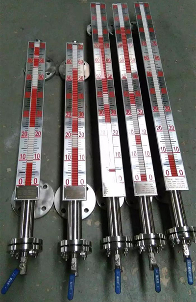 液位計根據浮力原理,浮子在測量管內隨液位的升降而上下移動,浮子內的永久磁鋼通過磁耦合作用,驅動紅、白色翻柱翻轉180’液位上升時,翻柱由白色轉為紅色,下降時,翻柱由紅色轉為白色,從而實現液位的指示。