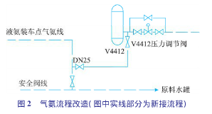 1)將液氨裝車氣氨返回線由進酸性水中間罐改為進氨氣分液罐V4412。以前,氣氨返回線至酸性水中間罐,由于液氨裝車時有大量氣氨返回原料水中間罐,氣氨不能及時吸收、溶解,造成原料水中間罐(V4410或V5407)壓力上升,水封被破壞,罐內(nèi)氣體外逸,形成安全環(huán)保隱患。為減少原料水罐氣氨返回量,在大檢修期間,增加了氣氨至V4412入口管線流程(氨壓機入口)。具體流程見圖2。