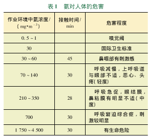 氨氣是一種無色透明而具有刺激性氣味的氣體,*易溶于水成為氨水(又稱氫氧化銨),呈弱堿性,1%水溶液pH值11.7。氨易液化,經(jīng)壓縮后成為液氨。根據(jù)衛(wèi)法監(jiān)發(fā)(2003)142號《高毒物品目錄》,氨氣屬于2.3類高毒氣體,8類腐蝕品,火災(zāi)爆炸危險性類別為乙A類。氨與空氣混合到一定比例時,遇明火能引起爆炸,其爆炸*限(體積分?jǐn)?shù))為15.5%~25%。低濃度氨對粘膜有刺激作用。高濃度氨可引起組織溶解性壞死、皮膚及上呼吸道粘膜化學(xué)性炎癥及燒傷、肺充血、肺水腫及出血等。常易發(fā)生輕度、重度中毒。外露皮膚可出現(xiàn)II度化學(xué)灼傷。氨對人體的危害見表1。