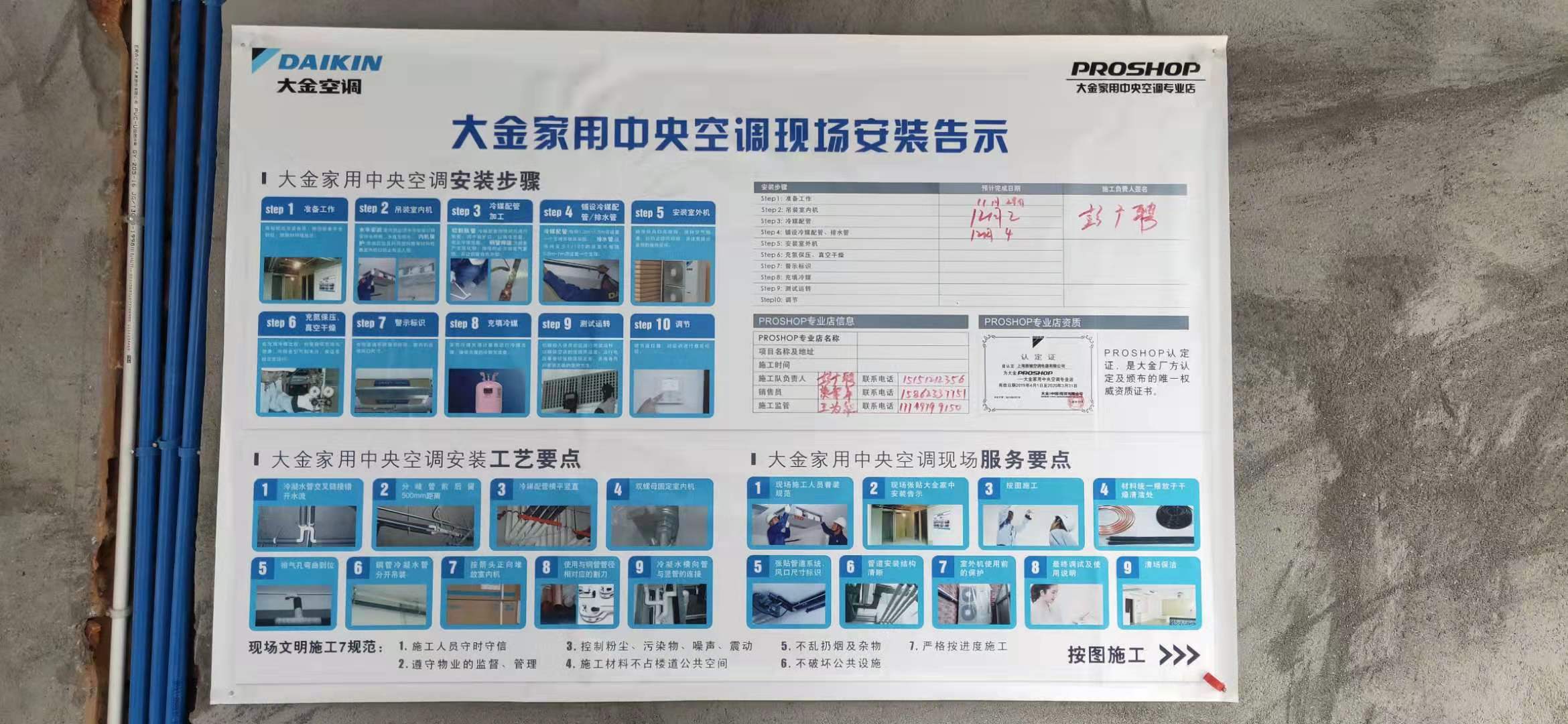 (3)貼上標(biāo)識貼:留有公司客服人員電話,萬一裝修公司工人在施工中有問題,需要聯(lián)系中央空調(diào)施工,可以直接方便聯(lián)系。