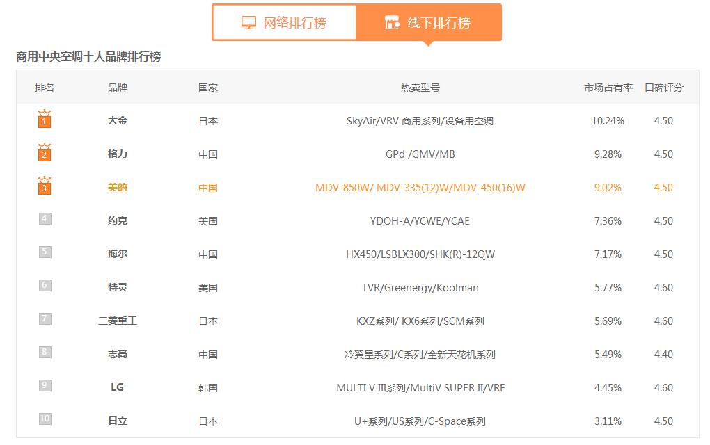 目前,辦公樓、商場(chǎng)、酒店等大型場(chǎng)所都使用中央空調(diào),因?yàn)槠胀ǹ照{(diào)的功能滿足不了這些場(chǎng)所的需求。商用中央空調(diào)有哪些牌子?三菱電機(jī)、美的、大金、格力、海爾、日立、特靈、開利、約克、麥克維爾、東芝、遠(yuǎn)大等眾多世界知名中央空調(diào)品牌排名如下: