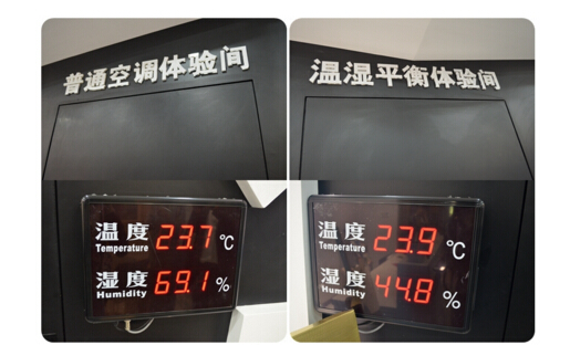 普通空調(diào)體驗間的溫度與大金溫濕平衡體驗間的溫度幾乎一致,但是濕度的差異卻相當大,在普通空調(diào)體驗間由于過高的濕度讓人感覺十分不適,有種悶熱的感覺;而在大金溫濕平衡體驗間,這樣的溫度和濕度下卻感覺很涼爽甚至有些冷。