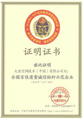 近日,國(guó)家質(zhì)量監(jiān)督檢驗(yàn)檢疫總局產(chǎn)品質(zhì)量申訴處理中心向大金空調(diào)頒發(fā)了“全國(guó)百佳質(zhì)量誠(chéng)信標(biāo)桿示范企業(yè)”證書,旨為彰顯質(zhì)量誠(chéng)信標(biāo)桿企業(yè)的引領(lǐng)作用,增強(qiáng)全社會(huì)的質(zhì)量誠(chéng)信意識(shí),引導(dǎo)全社會(huì)積極響應(yīng)“中國(guó)制造2025”戰(zhàn)略。在全國(guó)各行業(yè)內(nèi)審核確認(rèn)“全國(guó)百佳質(zhì)量誠(chéng)信標(biāo)桿示范企業(yè)”,大金空調(diào)為今年全國(guó)范圍內(nèi)的百家獲獎(jiǎng)企業(yè)之一。