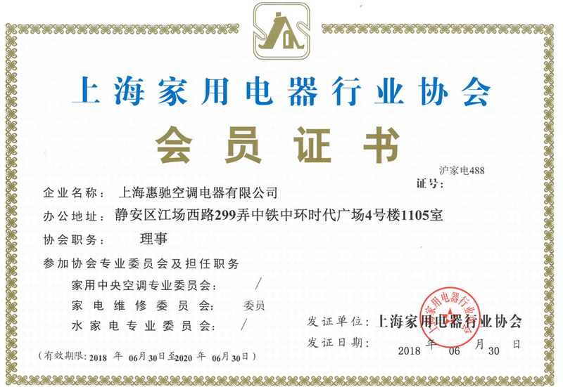 上海家用電器行業(yè)協(xié)會(huì)會(huì)員證書